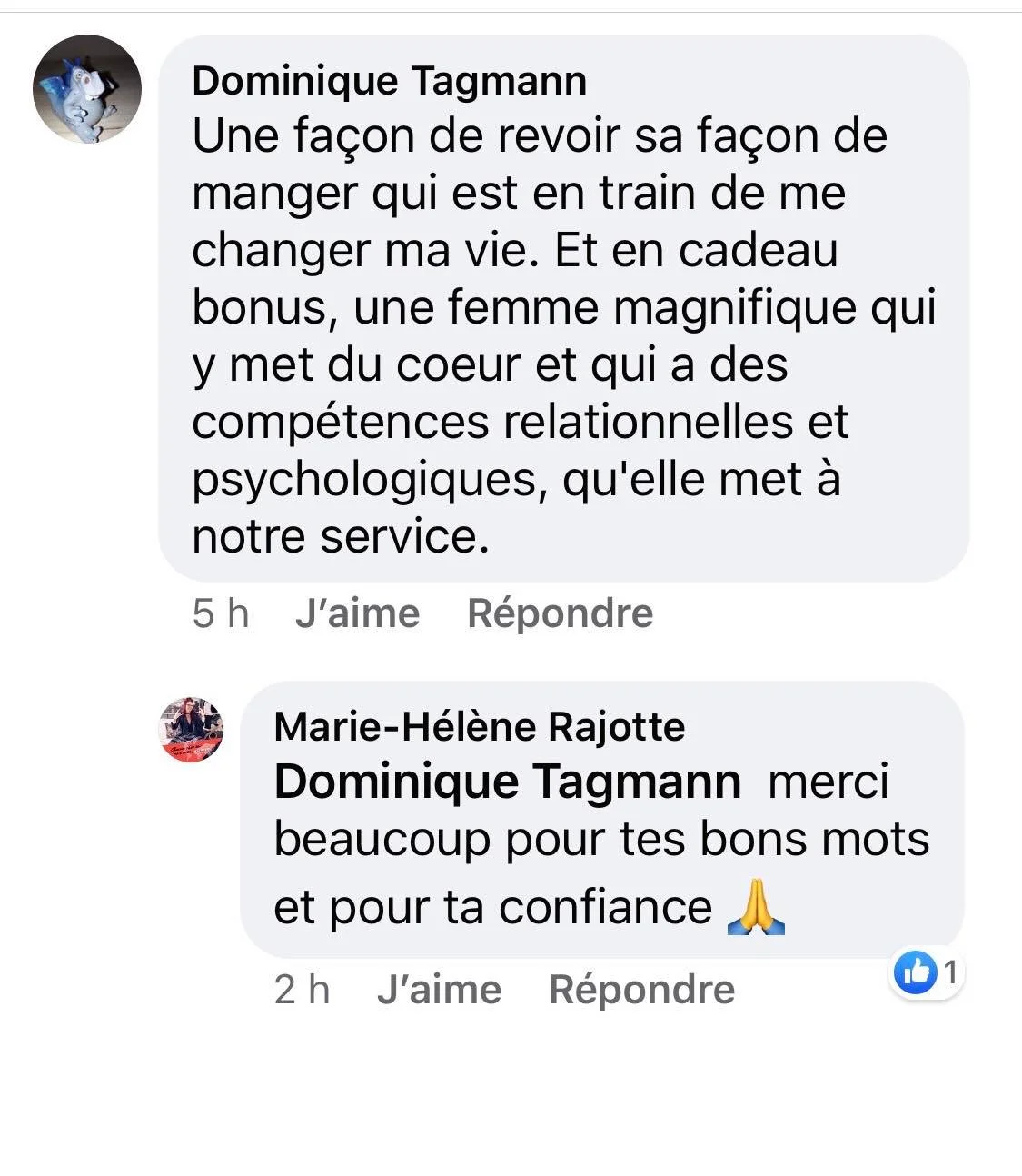 Ayant moi-même éliminé 85 lbs, je suis devenue naturothérapeute grâce à mon parcours personnel et plusieurs formations professionnelles. Depuis les 5 dernières années, je suis coach et stratège en alimentation consciente.